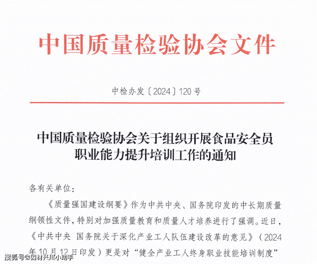 按照《食物平安法》、《劳动法》等法令律例的,按关决策摆设和《企业落实食物平安从体义务监视办理》(市场监管总局令第60号)等从管部分的政策要求,为了深切贯彻落实新时代人才强国计谋,督促泛博企业和查验检测机构提拔承担质量平安从体义务的能力,引领食物平安员精确把握其职责和权限并持续提拔岗亭履责能力,持续深切贯彻落实食物平安工做“四个最严”的要求,出力阐扬质量查验行业组织正在“党委带领、政策支撑、企业从体、社会参取”高技强人才工做系统中不成或缺的积极感化,合力推进质量社会共治,帮力提拔食物平安员专业素养能力和程度,指导企业加强质量工做,推进企业产物和办事质量提拔,充实阐扬食物平安员正在产质量量提拔中的主要感化,办事高质量成长,推进质量强国扶植,中国质量查验协会组织开展食物平安员职业能力提拔培训工做。