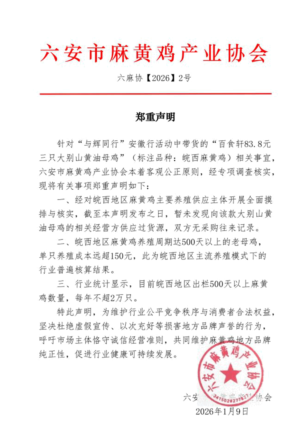 近日,据中国食物平安网报道,六安市麻黄鸡财产协会发布声明,指出该产物存正在虚构品种、外不雅不符、货源不明等多沉问题,取其宣传的“严苛选品”构成明显反差。